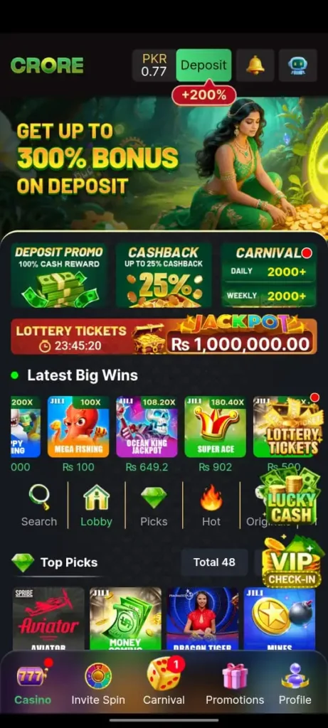 Crore 777 is quickly becoming a favorite choice for many users in Pakistan. The app provides different ways to win, including jackpots, login bonuses, and lucky spins. It supports Easypaisa and JazzCash, which makes deposits and withdrawals super easy. With its 24/7 support and regular updates, players feel secure and confident using the app. If you’re searching for a real money app that’s simple yet rewarding, Crore App is an excellent option.