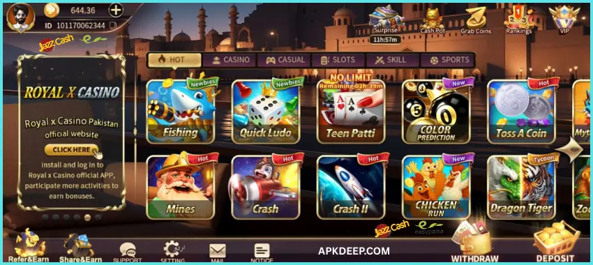 The app is not just limited to one country but has grown worldwide, including in Pakistan. It accepts multiple currencies such as US dollars and Pakistani rupees, so players can easily manage their funds. Deposits and withdrawals are safe, secure, and instant with options like Easypaisa, JazzCash, and even Binance cryptocurrency. Royal X 555 game is designed for everyone who wants a trusted, enjoyable, and rewarding experience.